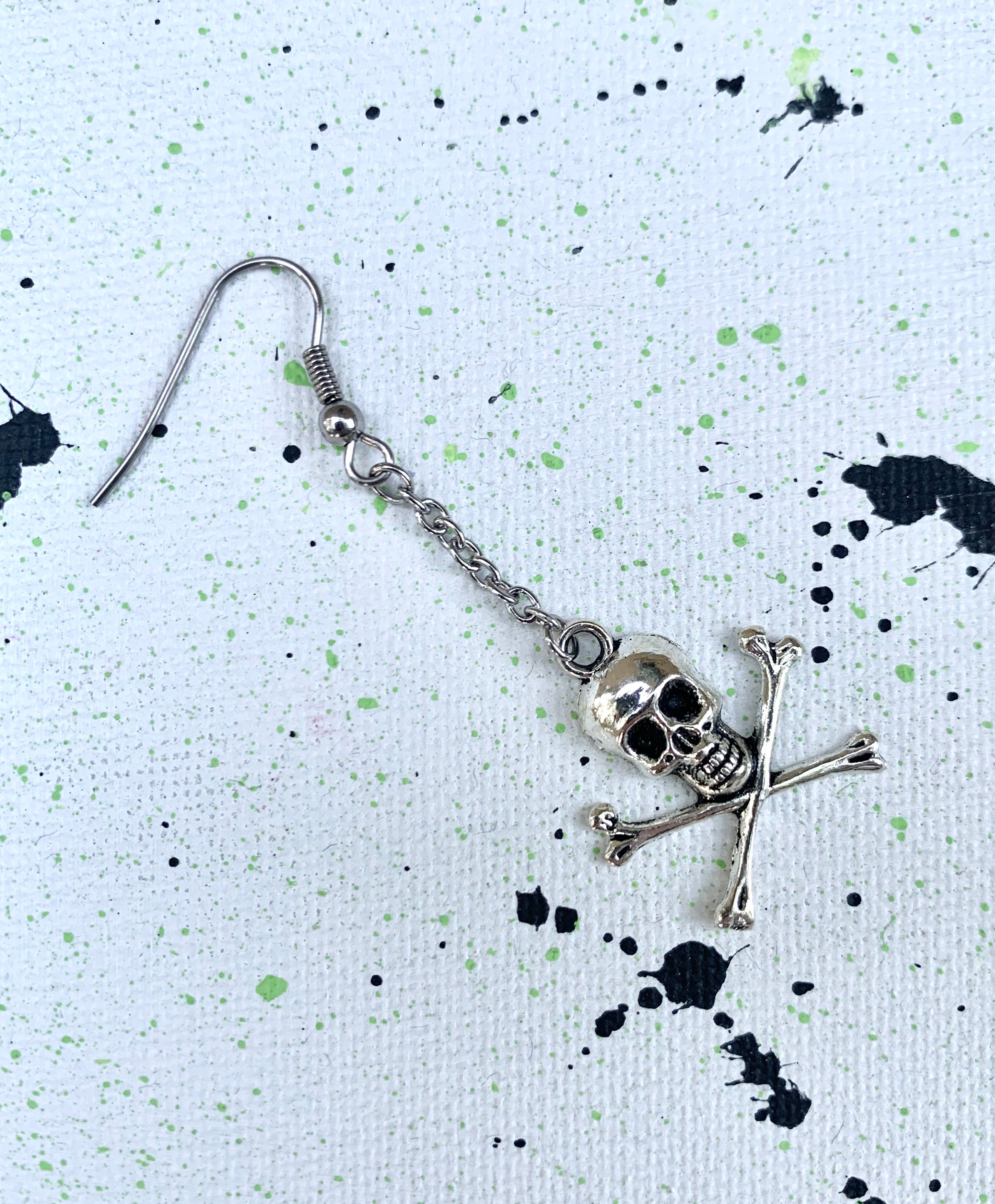 You really can't go wrong with the classic skull and cross bones anything and this cute dangly earring proves just that! This earring has been hand made with a stainless steel earring hook attaching a skull and cross bones charm with stainless steel chain. Total length: 2 inches, skull size: 1 inch x .75 inch.