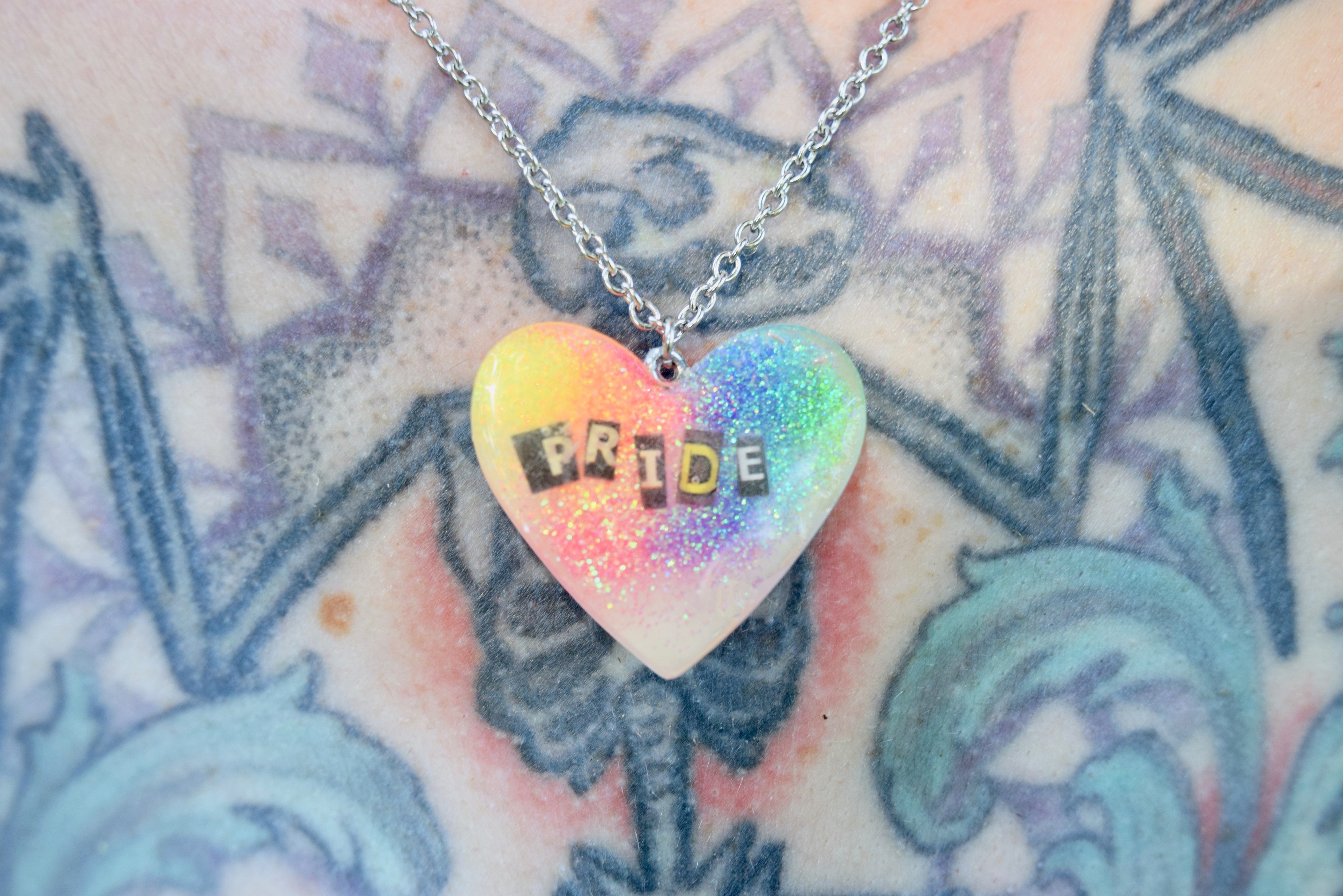 Hand made and one of a kind Pride Necklace, with ransom note style lettering painstakingly cut from a magazine, hand dyed with a bit of glitter in the background. Approx 1"x 1"